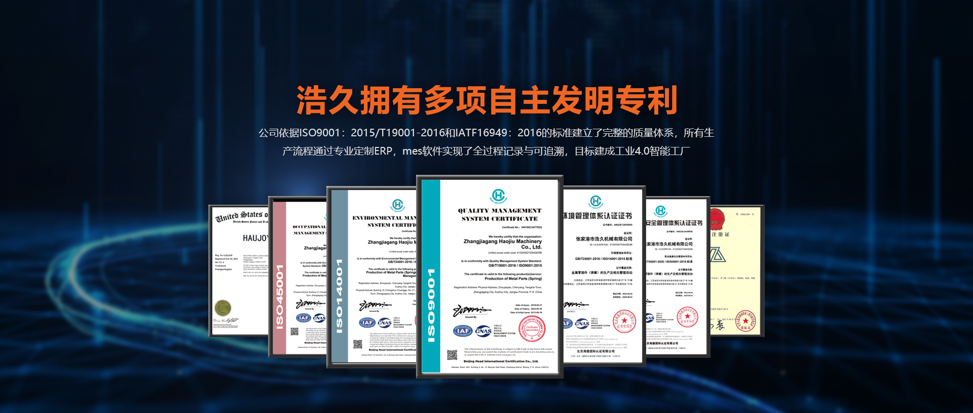 浩久擁有多項自主發(fā)明專利。公司依據(jù)ISO9001GB/T19001-2016和IATF:2016的標(biāo)準(zhǔn)建立了完整的質(zhì)量體系,所有生產(chǎn)流程通過專業(yè)定制ERP,mes軟件實現(xiàn)了全過程記錄與可追溯,目標(biāo)建成工業(yè)4.0智能工廠。